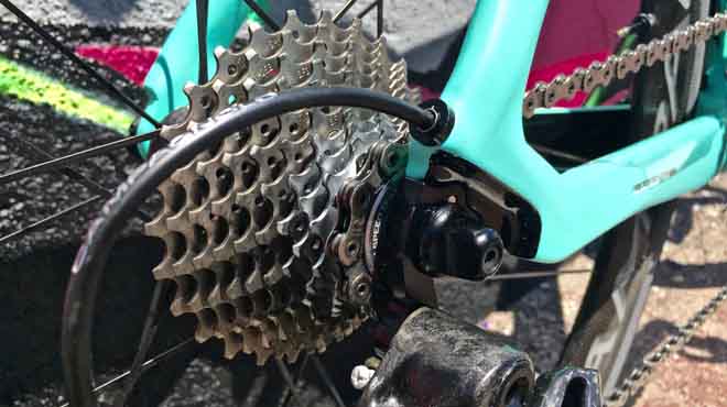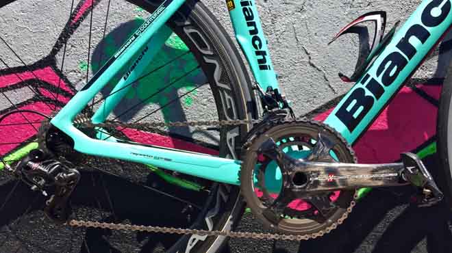 Sia la forcella che i foderi posteriori sono predisposti per accogliere i freni di tipo direct mount, l’ultimo standard che si dimostra più leggero di quello tradizionale e garantisce frenate davvero eccellenti. I forcellini sono in carbonio, ma per proteggerne la struttura, Bianchi ha deciso di schermarli con una sottile lamina metallica giusto per preservarli in caso di cambi ruota maldestri.