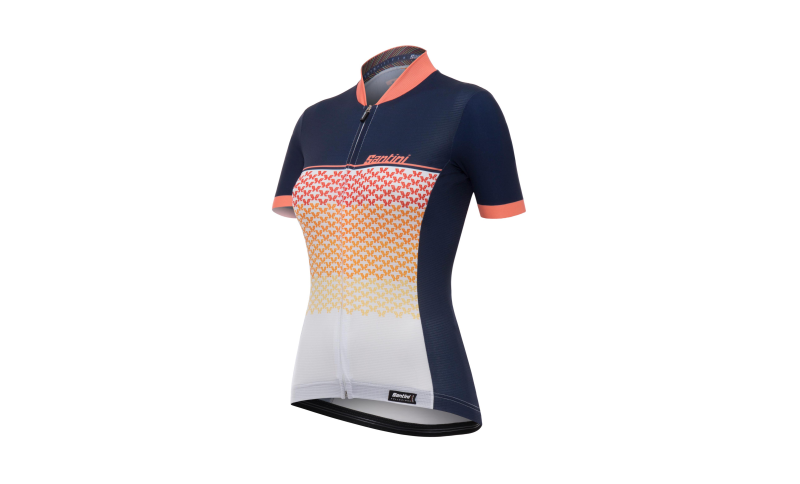Il design della jersey è caratterizzato da piccole farfalle formate ognuna da 4 S di Santini e gioca sui tre varianti colore molto femminili: arancio, viola e verde acqua.