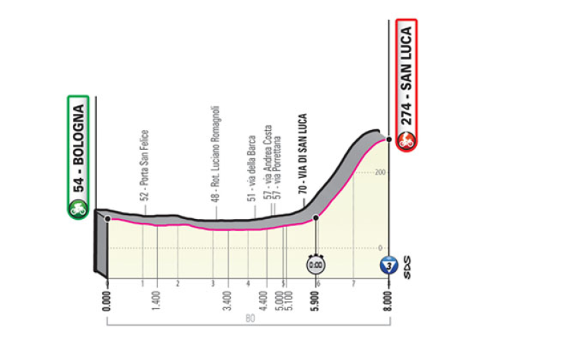 Il santuario della Madonna di San Luca, realizzata alla metà dl 1700, sul colle della Guardia, a sud-ovest del centro storico petroniano, è sede del traguardo della prima tappa del Giro d’Italia 2019, una cronometro individuale di km. 8,200 che parte dal cuore cittadino per proporre quindi l’impegnativa ascesa al Colle della Guardia. Qui sorge il Santuario della Madonna di San Luca, con splendida vista sulla sottostante pianura e la visione panoramica di Bologna con, in primo piano, il glorioso e storico stadio intitolato a Renato Dall’Ara, presidente per circa trent’anni della squadra rossoblù, formazione titolare di sette scudetti di campione d’Italia, quando era “lo squadrone che tremare il mondo fa”, oltre al complesso della Certosa.