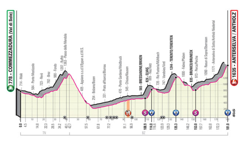 La tappa numero 17 si svolge interamente nel Trentino-Alto Adige e offre ancora, nel menù, la montagna ma con accenti più dolci, assai meno severi, rispetto alfamoso ma faticoso da scalare, “totem” ciclistico della frazione precedente e con una distanza molto più contenuta.