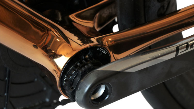 Come racconterà Stefan Bötticher, abile e famoso pistard tedesco, questo telaio appaga con robustezza e comfort. Il solido movimento centrale e i foderi posteriori dialogano alla perfezione offrendo grande feeling. Il telaio in acciaio CrMo è una struttura quasi circolare e fa a meno della classica suddivisione in triangolo anteriore e posteriore. Questa geometria rinuncia così al tubo verticale e apre la via ad una flessibilità controllata che appaga in termini di comfort. La finitura esterna lucida e ottenuta in rame è da applausi, il massimo per far emergere linee e curve di assoluto rilievo.