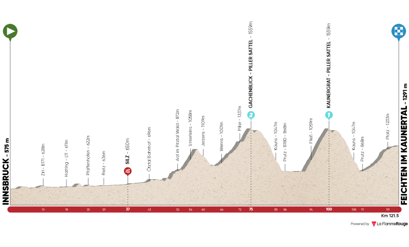 La prima tappa con arrivo a Innsbruck è servita per prendere confidenza con le strade tirolesi, ma già questa seconda frazione, da Innsbruck a Feichten im Kaunertal di 121,5 km, i big della generale dovranno farsi trovare pronti. Gli ultimi 55 km sono da cardiopalma, con la doppia scalata di Piller Sattel, da due versanti diversi, che disintegrerà senza dubbio il gruppo. A 46 km dall’arrivo si scollinerà dal versante di Gachenblick (2a cat. 9,1 km al 5,9%), ma sarà soprattutto la seconda salita dal versante di Kaunergrat (1a cat.) a decidere la tappa, con 7,5 km al 9,3% micidiali, che termineranno a 21 km dall’arrivo. Dopo la discesa, inoltre, gli ultimi 10 km verso Feichten im Kaunertal, nel bel mezzo delle Alpi Venoste, saranno in leggera ma costante ascesa, ideali per chi avrà ancora la forza di attaccare. Dopo questa tappa, la classifica generale avrà una fisionomia già ben definita.
