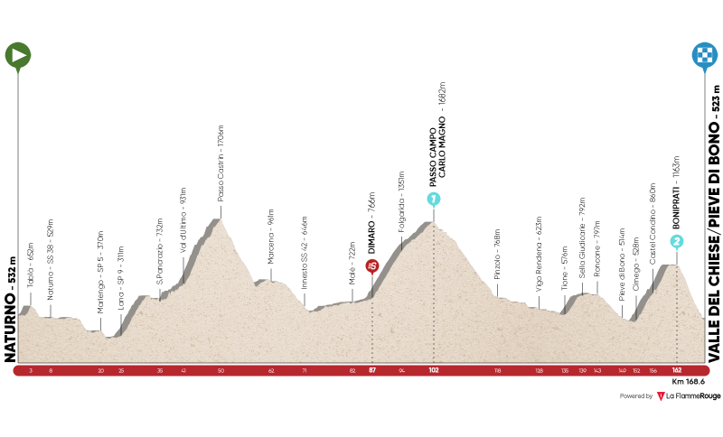 Con ogni probabilità con la Naturno - Valle del Chiese/Pieve di Bono di 168,6 km capiremo chi sarà il vincitore del Tour of the Alps 2021. Dall’Alto Adige si andrà in Trentino per la tappa più lunga con quasi 4000 metri di dislivello complessivi: si parte da Naturno e il primo grande ostacolo sarà il Passo Castrin (24,4 km al 5,6%), che con i suoi 1706 metri sarà la cima più alta di questa edizione del TotA e metterà subito grande fatica sulle gambe degli atleti. Dopodiché sarà la volta di Passo Campo Carlo Magno (1a cat., 14,4 km al 6,6%), che verrà scollinato a 66 km dal traguardo e sarà solo l’antipasto dell’ultima e decisiva salita di Boniprati (2° cat.). 10 km al 6,8% con punte al 10%, che si concluderanno a soli 7 km dall’arrivo: chi vorrà vincere il TotA dovrà per forza di cose fare la differenza qua. Dopo lo scollinamento, una picchiata nel bel mezzo della Valle del Chiese porterà i corridori all’arrivo di Pieve di Bono.