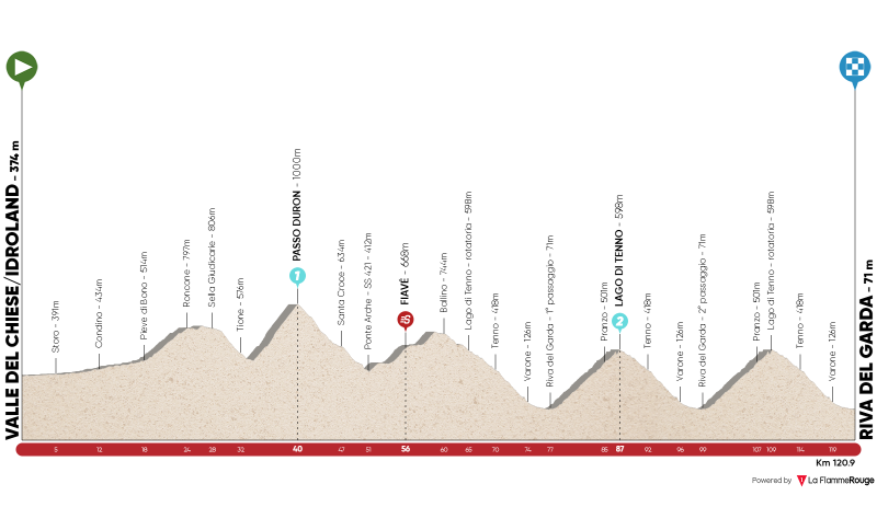 Gli ultimi 120,9 km del Tour of the Alps 2021 non sono per nulla scontati. Dalla Valle del Chiese, in località Idroland, alla splendida Riva del Garda, Simon Yates dovrà ancora faticare per portarsi a casa la gara, visto che il percorso offre spazio ai ribaltamenti. Il Passo Duron (1a cat. 6,4 km al 7,9%) dopo 40 km sarà il primo test per vedere se tutti hanno recuperato dalle fatiche della tappa regina, ma sarà il circuito finale di Riva del Garda, da ripetere due volte, a mettere il punto esclamativo su questa edizione della corsa Euroregionale. La salita verso il Lago di Tenno (2a cat., 8,5 km al 6,2%) da scalare due volte, con scollinamento a 33 e 11 km dall’arrivo, sarà il trampolino di lancio ideale per provare a dare l’ultima e definitiva rimescolata alla classifica generale, oltre alla chance di portarsi a casa una prestigiosa vittoria di tappa.