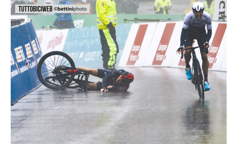La divertente tappa regina del Giro di Romandia 2021, che si è corsa sotto il classico diluvio della corsa svizzera, è stata resa ancora più memorabile dalla caduta di Geraint Thomas sul rettilineo conclusivo. Il capitano della Ineos Grenadiers era impegnato nell'ultimo affondo verso il traguardo, giocandosi la vittoria parziale e la maglia di leader con Michael Woods, ma a circa 100 mt dall'arrivo la mano gli è scivolata dal manubrio mentre era in spinta e in un baleno si è ritrovato per terra.
