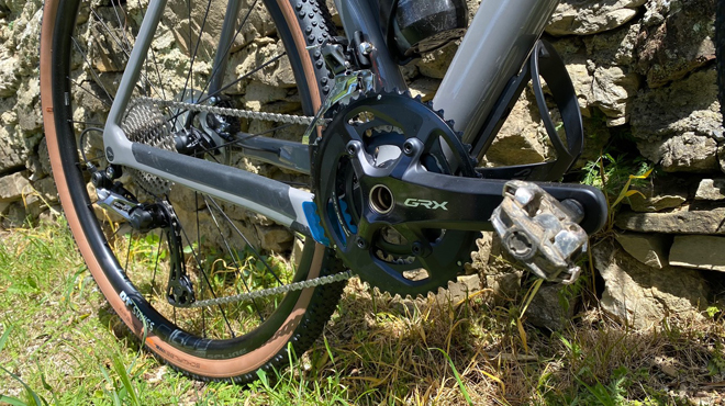 Parola d’ordine controllo: short stem e wide bars. Clearance ampia, vernice solida e poi tanti punti per fissare borse ( sulla forcella troviamo due classici For Cage Mounts- uno Top Tube Mounts -due fender mountain al posteriore, tutti con carichi massimi ben segnalati ). La configurazione piena prevede tre borracce, di cui una sotto al movimento centrale, spettacolo! In prova ho la Grizl CF SL 8 Earl Grey montata con Gruppo Shimano GRX, ruote DT SWISS C1850 Spline, gomme Schwalbe G-ONE Bite da 45, manubrio e pipa in alluminio e reggisella VCLS. Poca strada, ovvero poco asfalto per ora e via subito per i sentieri più complicati della mia zona, Grizl è una scheggia, divertente e reattiva.