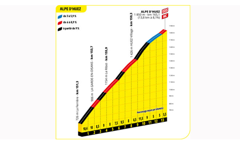 Si scende in picchiata su Allemond, si affronta una quindicina di chilometri di fondovalle per arrivare alle pedici dell'Alpe d'Huez e si ricoincia a salire: 13,8 km all'8,1% con 21 tornanti per celebrare la prima volta del Tour lassù, 70 anni fa, con impresa trionfale di Fausto Coppi. E gli organizzatori del Tour hanno scelto davvero un bel modo per celebrare il 14 luglio e la festa nazionale...