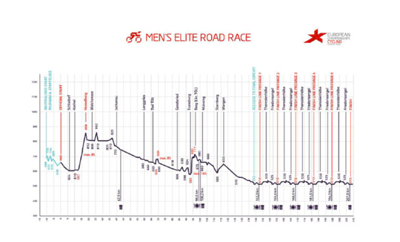 Sono 207.9 i chilometri da percorrere con partenza da Murnau e arrivo nel cuore di Monaco di Baviera. Sulla carta è una che chiama alla ribalta le ruote veloci: nella prima parte i corridori dovranno affrontare brevi ma ripide salite, tutte non impegnative e tutte concentrate nei primi 100 km di corsa. Si comincia poi a scendere leggermente lungo la strada che porta a Monaco di Baviera dove si entra in un circuto pianeggiante le cui uniche difficoltà sono legate alle numerose curve. E, come detto, tutto lascia pensare che sul traguardo di Odeonsplatz sarà una volata ad assegnare il titolo continentale.