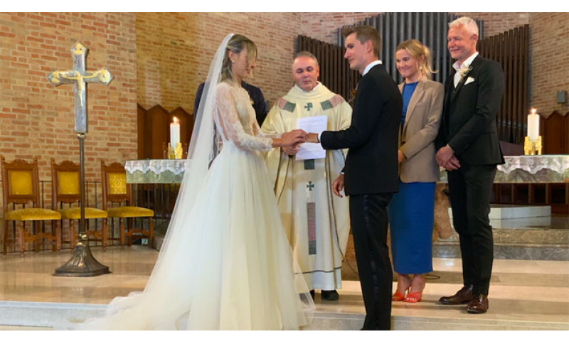 Il ciclista danese è arrivato in chiesa con un abito a firma Armani, mentre Marilisa ha scelto un abito color madreperla con velo lungo. Testimone per la sposa è Alessandro Minotto, gioielliere. I testimoni di Mikkel sono stati Lars e Maria.