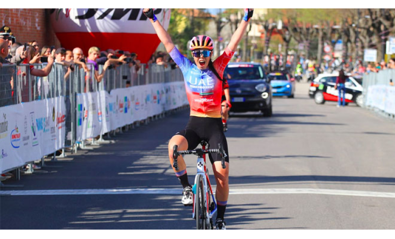 E’ forte, simpatica e vincente. Quando è in mezzo alle colleghe lei è come un inno alla gioia. Carlotta Cipressi vive un momento magico nel suo secondo anno da elite. In apertura di stagione ha vinto con la sua Uae Development la cronosquadre del Trofeo Ponente in Rosa, indossando per un giorno la maglia rosa da leader. “La maglia rosa, una grande emozione”. Dal rosa all’amaranto: al recente Giro del Mediterraneo la briosa Carlotta si è aggiudicata due tappe e la classifica finale. L’ amaranto è appunto il colore simbolo del primato nella corsa campana. Il “Ponente” è del calendario internazionale e la corsa “Mediterraneo”, seppur con etichetta di nazionale aveva pure le straniere al via, quindi Carlotta va promossa a pieni voti.