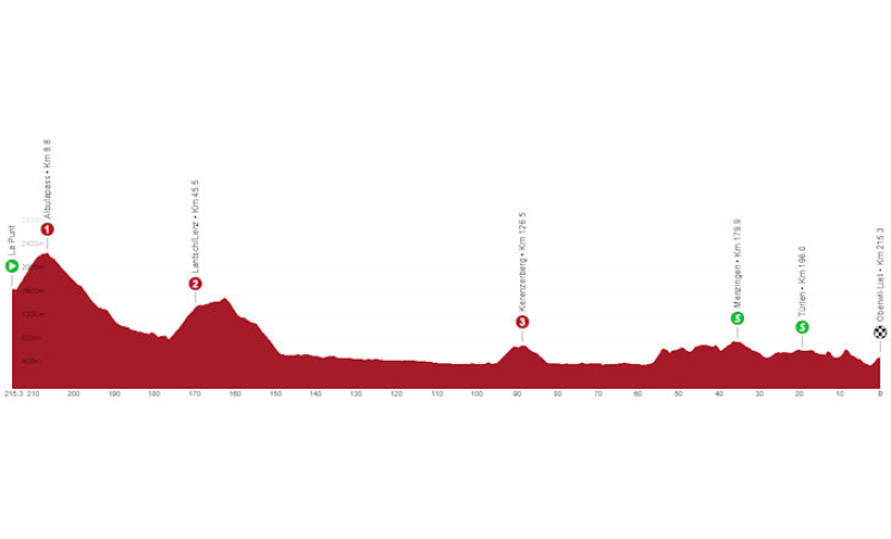 Le difficoltà di questo Giro di Svizzera sono però tutt’altro che finite, perché la quinta tappa mette sul piatto 211 km, da Fiesch a La Punt, con scalata in apertura del Furkapass (16,5 km al 6,7%) e dell’Oberalpass (10,7 km al 5,6%), dopodiché nel finale ci sarà il decisivo Albulapass (17,4 km al 6,8%) che verrà scollinato a 10 km dall’arrivo, prima della picchiata sul traguardo. Neanche il giorno seguente si potrà stare del tutto tranquilli, con la La Punt - Oberwil-Lieli di 216 km. Il finale non è facile da interpretare, con lo strappo di Islisberg (1,4 km all’8,3%) a 8 km dall’arrivo e poi gli ultimi 2500 metri verso l’arrivo costantemente in salita al 6/7%.
