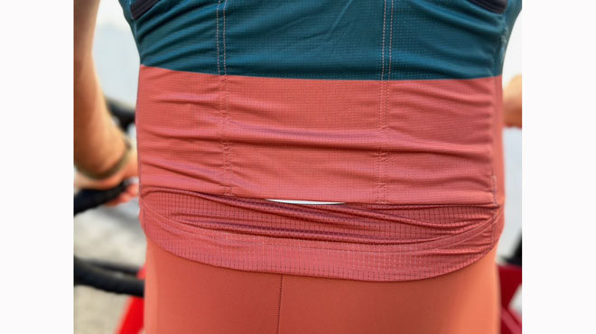 Ultraleggera e aderente, così si presenta la jersey Angelina. Il tessuto super traspirante si è ben comportato nelle ultime giornate offrendo il giusto confort visti i trenta e passa gradi. Il tessuto, prodotto in Italia, ha una mano morbidissima e avvolge il corpo molto bene. La lunga cerniera è sottile e precisa e non ostacola affatto la vestibilità. La maglia ha pannelli laterali in rete, una classica manovra per fasciare meglio il corpo, ma ben fatta in questo caso. Le strisce e il colore avvicinano questa maglia al mondo gravel, ma nel complesso si tratta di un prodotto decisamente elegante. Sul pannello laterale resta presente il logo dell’azienda e tre comode tasche.