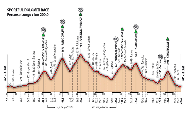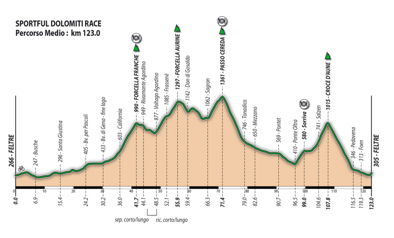 Chi affronterà il percorso lungo dovrà superare 200 km, con le salite di Forcella Franche, Passo Duran, Forcella Staulanza, Forcella Aurine, Passo Cereda e Croce d’Aune, mentre chi sceglierà il medio si eviterà Duran e Staulanza, per un totale di 123 km. Partenza e arrivo saranno ovviamente sempre a Feltre. (altimetrie in copertina)
