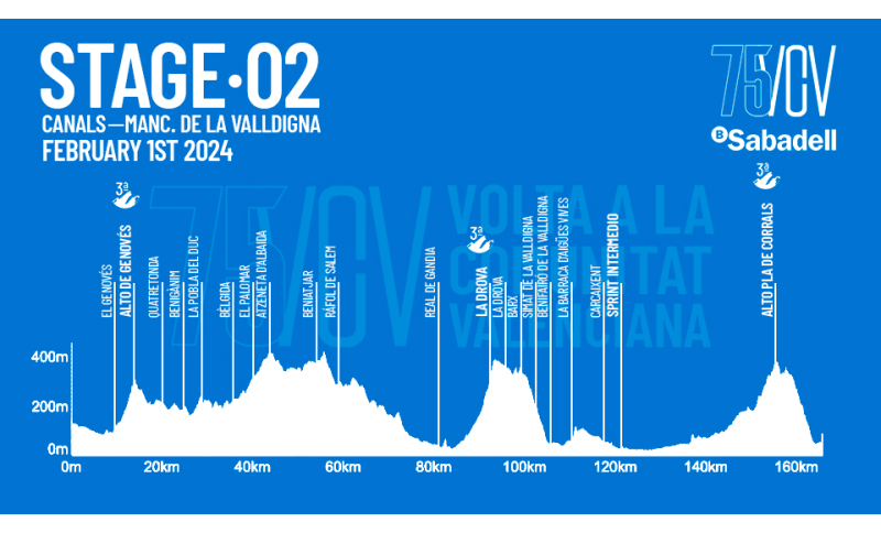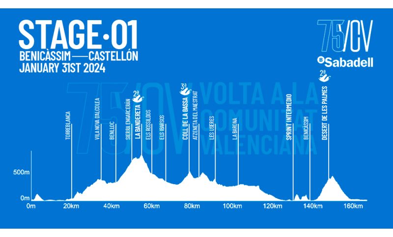 Si parte subito con una tappa insidiosa, da Benicàssim a Castellón de la Plana per 167 km e la salita di Desert de les Palmes (7,7 km al 5,1%) da superare a 19 km dal traguardo che dovrebbe permettere ad un gruppo ristretto di arrivare a giocarsi lo sprint. Profilo molto simile per la seconda tappa, la Canals-Mancomunitat de la Valldigna di 162 km, con l’Alto Pla de Corrals (5 km al 4%) piazzato a 10 km dalla linea d’arrivo.