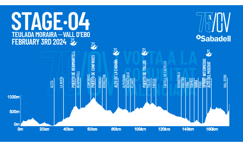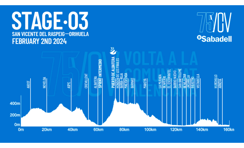 Il terzo giorno, nella San Vicente del Raspeig - Orihuela di 161 km, ci sarà spazio per i velocisti, che negli ultimi 90 km non troveranno praticamente alcuna asperità. A decidere le sorti della classifica generale sarà quindi la Teulada Moraira - Vall d'Ebo di 175 km, con 5 GPM e un arrivo in salita che dovrebbero fare differenze importanti. In particolare è l’Alto del Miserat il grande spauracchio di giornata, con i suoi 5,7 km al 9,3% di pendenza media e un ultimo km al 13%. Superato a 16 km, ci sarà poi l’arrivo in salita a Vall d’Ebo, con i 2 km al 7,5% che decideranno con ogni probabilità il vincitore di questa 75ª edizione della Volta Valenciana. Rapidissima la frazione finale, da Bétera a Valencia per soli 93 km: occhio alla salita de La Frontera (5 km al 9,3%), da scollinare a 45 km dal traguardo che, se la classifica dovesse essere ancora corta, potrebbe creare parecchio scompiglio.