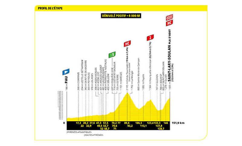 Si comincia con la Pau - Saint -Lary-Soulan Pla d’Adet di 151,9 km, tre Gpm, 4.000 metri di dislivello e traguardo posto a quota 1.669 metri.