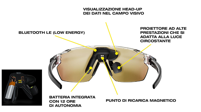 I dati del display si riflettono sulla lente e appaiono nel campo visivo dell’utilizzatore. I dati sono posizionati in un angolo del campo visivo, come se fossero proiettati nel paesaggio.