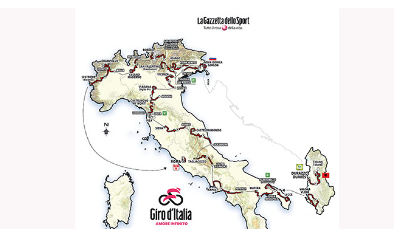 Da venerdì 9 maggio a domenica 1° giugno il Giro d'Italia viaggerà per 3.413 i km con 52.500 metri di dislivello, 10.000 in più che nella scorsa edizione. Ci proporrà due cronometro per un totale di 42,3 km, tre arrivi in salita (Tagliacozzo, San Valentino Brentonico e Sestriere) più altri tre che guardano all’insù, vale a dire Siena, Castelnuovo ne’ Monti e Vicenza. Sei (ma forse anche un paio in più) le possibili occasioni per i velocisti, tante le opportunità per gli attaccanti e per chi vuole inventare qualcosa.