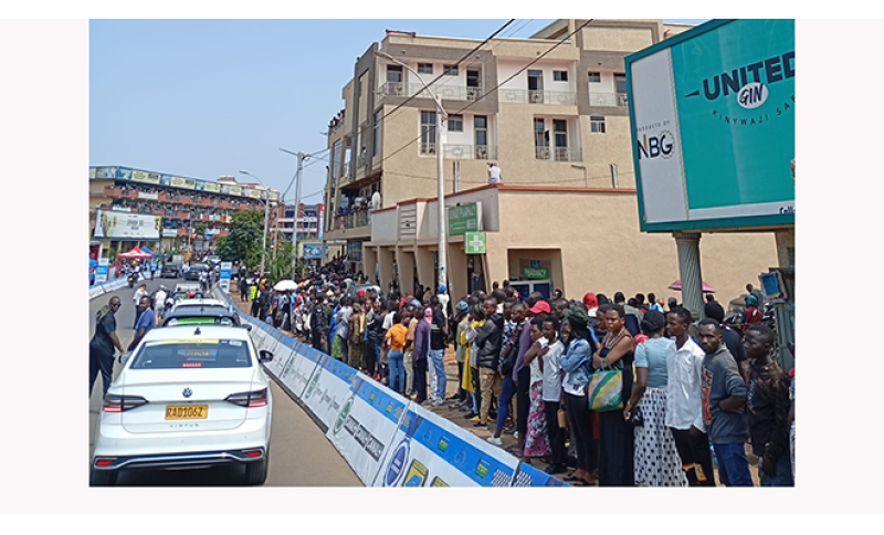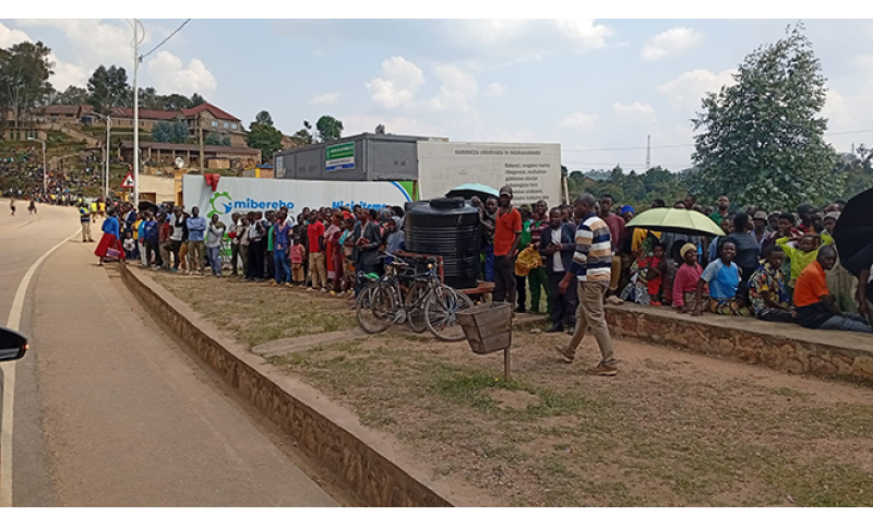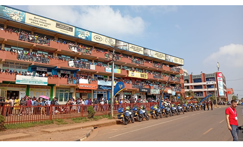 C’è un fermo immagine iniziale in quel di Rusizi, località posta sul versante del lago KIvu dove purtroppo, in territorio congolese, la situazione si è fatta drammatica. Avevamo già visto sul visore di un cellulare la fotografia di un edificio di quattro piani fuori terra, ora sappiamo dove si trova, nello stesso posto in cui nel 2024 venne posto un arrivo di tappa. Trovarsi di fronnte quel palazzo dal vivo ha un altro effetto, anche perchè pure a bordo strada, due ore ed un quarto prima lo start la folla si è assiepata ovunque, mentre le attività commerciali nel centro di frontiera sono aperte, compresi una quincaillerie ed un bar resto anche lui dal nome francese. La gente si assiepa dietro alle transenne rivestite con i marchi di sponsor silver, platinum e gold, che anche da questi particolari si giudica una manifestazione. Si parte, innalzandosi presto di quota, già per raggiungere il chilometro zero dopo il quale gli attaccanti di giornata non si faranno trovare impreparati. Così parlò radio tour…du Rwanda.