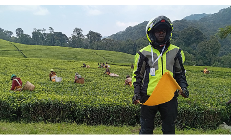 Procedendo si ha la conferma che le divise degli scolari, tantissimi, offrono un colpo d’occhio cromatico di forte impatto, forse anche qui con autonomia scolastica in vigore, visti grembiulini celesti, gialli, verdi, rossi. Sorpassate persone che portano in testa ananas e sacchi di patate con assoluta nonchalance, ci si imbatte (again) nei campi di the, mai come prima di un verde così acceso. Con discrezione verso chi lavora, un amico motociclista con bandiera, drapeau jeaune, si ferma e chiede permesso per qualche foto.