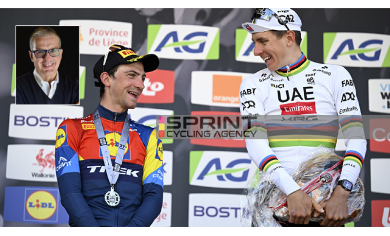 Tadej POGACAR. 10 e lode. For you D. Lo faccio per te, ha scritto con il pennarello sul numero 1 che ha spillato sulla schiena. L’ha fatto per Urska Zigart, la sua compagna, che tre anni fa, alla vigilia della Liegi, ha perso la mamma. Lui fa l’ennesimo numero, tagliando il traguardo con il dito indice ad indicare il cielo. Lo fa per noi, lo fa per se stesso andando ad aggiornare il suo personale taccuino ricco zeppo di risultati. Un attacco, uno solo, sulla Côte de la Redoute (1.6 Km al 8.9%): fine dei giochi. L’hanno visto, l’hanno sentito, l’hanno respirato, meno Remco Evenepoel, che si fa trovare indietro, come non mai: forse anche fuori condizione. È probabile che via radio qualcosa dicano allo sloveno, al quale non par vero: scatta e va. Un show in piena regola, senza palpiti, senza stress, troppo facile per un corridore che è già abituato a semplificare il complesso. Oggi aggiorna la contabilità della storia, per il momento con la “s” minuscola. Settima vittoria stagionale in quattordici giorni di corsa; 95 in carriera; 9° Monumento (2 Fiandre, 3 Liegi e 4 Lombardia), al pari di Fausto Coppi, Costante Girardengo e Sean Kelly, unico corridore capace di ottenere otto podi consecutivi nelle Monumento. Davanti a lui, con 11 Roger De Vlaeminck; a 19 lui, l’Immensità Eddy Merckx, che lo attende…