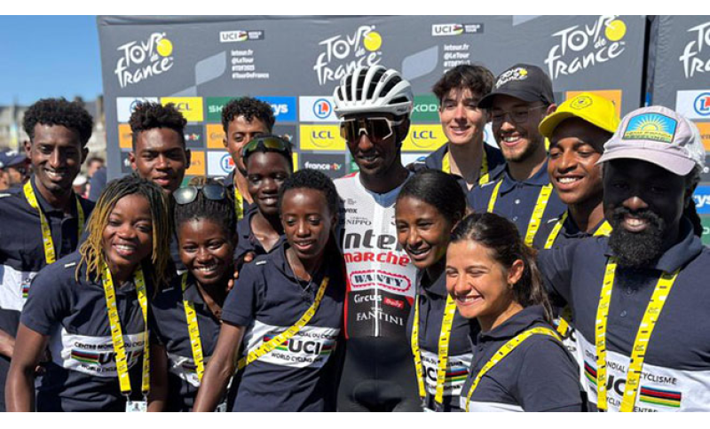 Prima la visita al quartier generale dell’Uci, in quel di Aigle, quindi il trasferimento in Bretagna, al seguito della settima tappa del Tour de France. Sono giornate dense di significato quelle che sta vivendo nel suo “road show” Samson Ndayishimiye , Presidente della Federatione Ciclistica del Rwanda. Capita – felice coincidenza- che da un altro capo del mondo, in Cina, Henok Mulubrhan sventoli il vessilllo eritreo al Tour of Magnificent Qinghai (2.Pro), proprio mentre un bel nugolo di giovani ciclisti africani, appartenenti al World Cycling Center Africa Project, posa in foto con Biniam Girmay. Cercate l’idolo sportivo di un Continente intero che pedala? Citofonare “Bini”, grande campione dell’Eritrea che proprio dal centro di Aigle ha iniziato la propria ascesa anche nelle corse europee e mondiali. A Saint-Malo il numero uno della Ferwacy realizza innanzitutto quanto si sia sempre di più assottigliato il lasso di tempo che separa dalla rassegna iridata di Kigali 2025. Sembra ieri, ed invece era il 2021, quando avvenne l’assegnazione, storica, in quanto si tratterà del primo mondiale in Africa: “una magnifica occasione di cui sarò sempre grato a chi ci ha scelto, entusiasmato da quest’esperienza al Tour” – ha premesso l’ex nuotatore che fu portabandiera del Rwanda ai Giochi di Sidney del 2000.