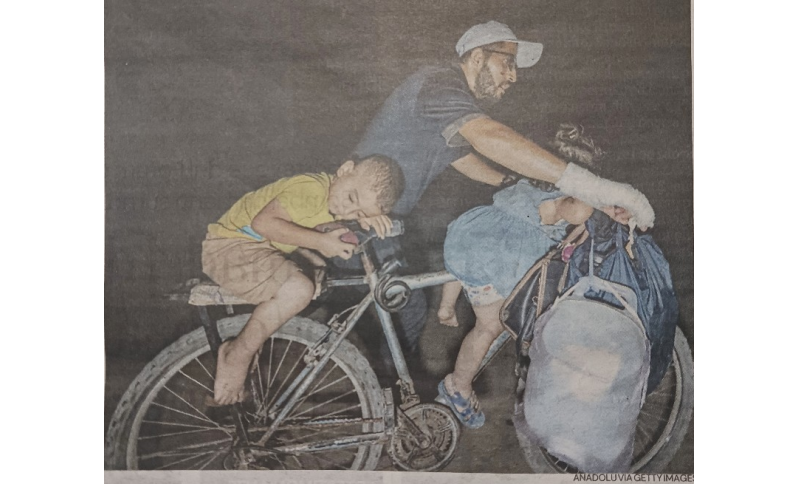 Riescono a sognare queste due creature, anche in equilibrio precario. Aggrappati dolcemente ad una bicicletta, che è cavallo alato e mongolfiera, aquilone e bolla di sapone. Non è zucchero filato, perché non c’è nulla di dolce in una fuga da un territorio di guerra, c’è solo il terrore di non farcela, ma questo è un sentimento che si legge nel volto di un padre che trasporta sporte di vita e di speranza residuale, che è pur sempre un sentimento generativo.