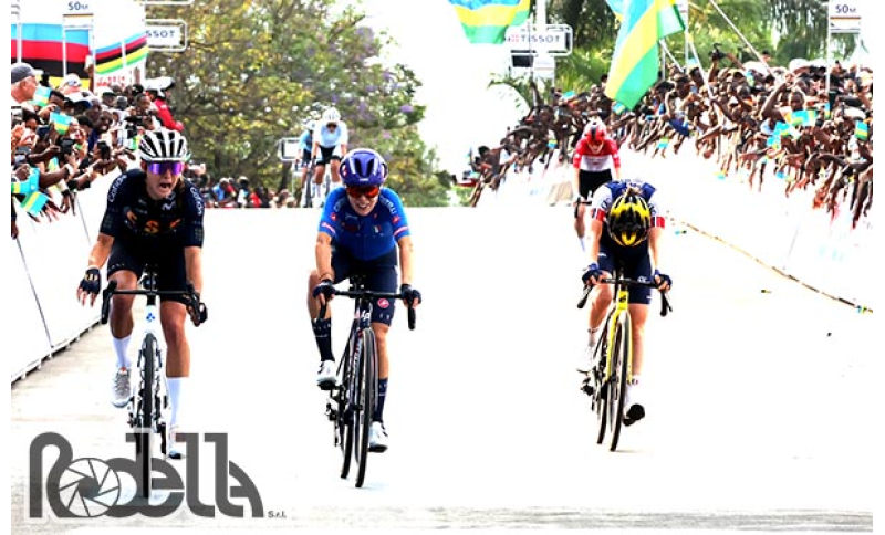 Allo scollinamento del Kigali Golf, Kagevi viene ripresa da Chladonova, Holmgren, Gery e Blasi; ai piedi del Kimihurura rientrano Ciabocco, De Schepper, Riedmann, Appleton, Bunel e Ivanchenko. Sono in 11 a giocarsela e a prevalere è l'unico team presente nel drappello con due atlete: gran gioco di squadra francese, con Marion Bunel che accelera sia sul pavè che alla flamme rouge costringendo Chladonova a spendere per chiudere, e ai -100 metri ecco la stoccata decisiva della U23 1° anno originaria dell'Ardeche in forza alla FDJ Suez, che aggiunge questo iride su strada a quello nel ciclocross tra le Juniores dello scorso anno.