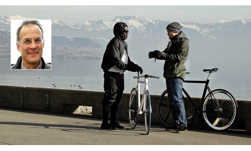 “Black and White”: bianco e nero, i colori dei telai delle due biciclette, i colori della pelle dei due uomini, i colori delle montagne che circondano il Lago di Losanna, i colori di un’anima senza sfumature, forse la stessa incapacità di accogliere sfumature, o bianco o nero, o di qua o di là, schierati, opposti, oppure, invece, proprio il bisogno, la necessità, l’urgenza, l’esigenza di conciliare, affiancare, fraternizzare, uomini e biciclette, le biciclette sono a scatto fisso, abbiamo voluto la bicicletta e allora pedaliamo. La foto di Yulia Raneva, russa di San Pietroburgo, è a colori.