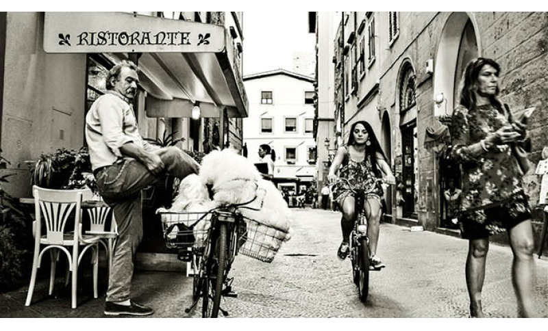 “Precious Cargo”: carico prezioso, quello che sbilancia la bicicletta a sinistra, due cani, due cani passeggeri, a spasso per le vie di Firenze, magari era da tanto tempo che ne sentivano parlare e avevano proprio la voglia, o almeno la curiosità, di esplorare il centro cittadino, il borgo storico, i palazzi rinascimentali, il selciato stradale, le vetrine di negozi e botteghe, o semplicemente altre biciclette e altri preziosi carichi, qui una ciclista impegnata a dribblare passanti e turisti. La foto di Greg Bolger, canadese, è in bianco e nero, il bianco che più candido non si può, della pelliccia dei cani, il nero a cominciare da quello dei copertoni.