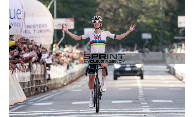 La Tre Valli Varesine numero 104 è di Tadej Pogačar (UAE Team Emirates – XRG). Il campione del mondo e d’Europa, già vincitore di questa competizione nel 2022, ha tagliato il traguardo di Via Sacco a Varese a braccia alzate dopo una fuga solitaria di 22 chilometri in cui ha “inflitto” 45" di distacco al plotone regolato da