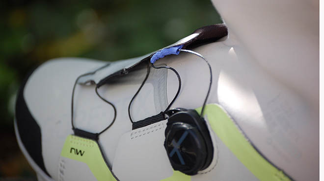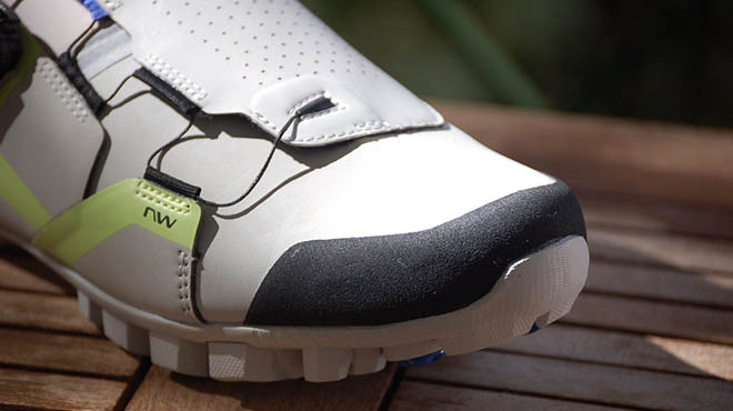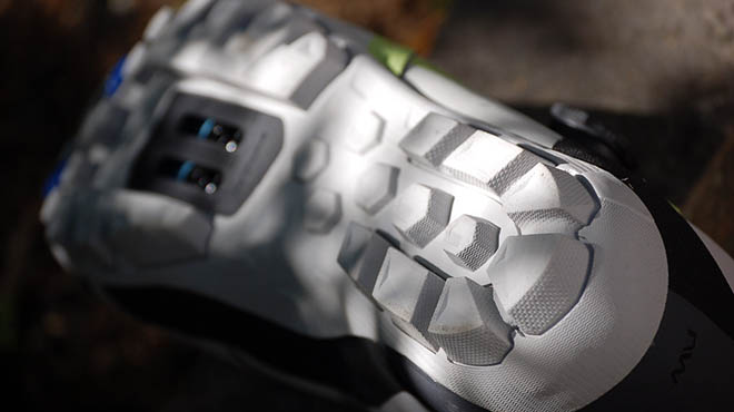 La suola Jaws Evo offre grande equilibrio tra efficacia nella pedalata e comfort durante la camminata, un fattore davvero importante se prevedete soste e tratti da fare a piedi, merito soprattutto de sistema di flessione della punta e del supporto dell’arco plantare, uno dei migliori per la categoria. Il Flexi System, così si chiama il sistema messo a punto da Northwave, concede alla parte anteriore della suola di flettere se si cammina e a perfezionare il gesto ci penseranno i generosi inserti in gomma, ottimi per come facilitano la camminata garantendo grip e un facile instradamento della tacchetta sul pedale. Per la chiusura troviamo il collaudassimo sistema X-Dial SLW3, preciso e sicuro come non maio. Il meccanismo, compatto e leggero, si distingue per la presenza di un pulsante laterale che rilascia la chiusura in modo micrometrico o totale a seconda delle vostre esigenze.
