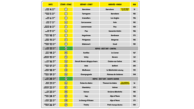 Ci saranno tante montagne e la corsa gialla toccherà le cinque catene montuose francesi: Pirenei, Massiccio Centrale, Jura e Vosgi e sulle Alpi ci saranno due arrivi all'Alpe d'Huez, tra cui un'ascesa senza precedenti dal Col de Sarenne alla vigilia del traguardo a Parigi. Il viaggio verso nord-est si snoderà attraverso le montagne del dipartimento del Cantal, con arrivo di tappa a Le Lioran (10a tappa), seguito da Jura e Vosgi. Dopo due settimane di gara, Le Markstein inaugurerà un weekend in cui tutto può succedere. La salita alla stazione sciistica arriverà al termine di una serie di sofferenze con la nuovissima Le Haag (14a tappa), che potrebbe rivelarsi decisiva quanto il Plateau de Solaison (15a tappa), pronto a debuttare al Tour subito dopo il Col du Salève.