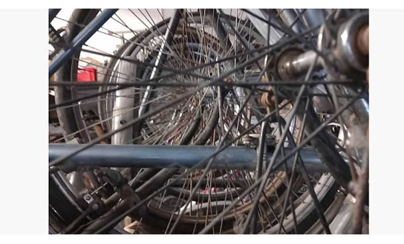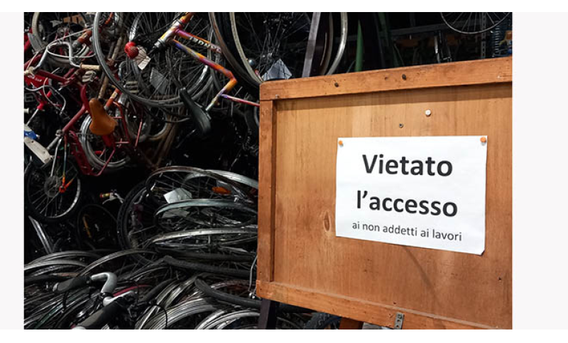 Ci sono Bianchi e Legnano davanti alle quali genuflettersi, Benotto e Atala che spingono a credere o a ricredersi, Sambi e Vicini che inducono a ricordare, una Windsor irriducibile e una Umberto Dei valorosa, ma anche ciarpame da supermercati e cancelli da ipermercati. Ci sono scatoloni pieni di fanalini e bidoni ripieni di forcelle, telai appesi al chiodo e cerchioni attaccati al gancio, pedali prepensionati e parafanghi freelance in attesa di una nuova opportunità. E’ una fortuna che non abbiano voce in capitolo: se solo potessero raccontarne uno della loro storia…