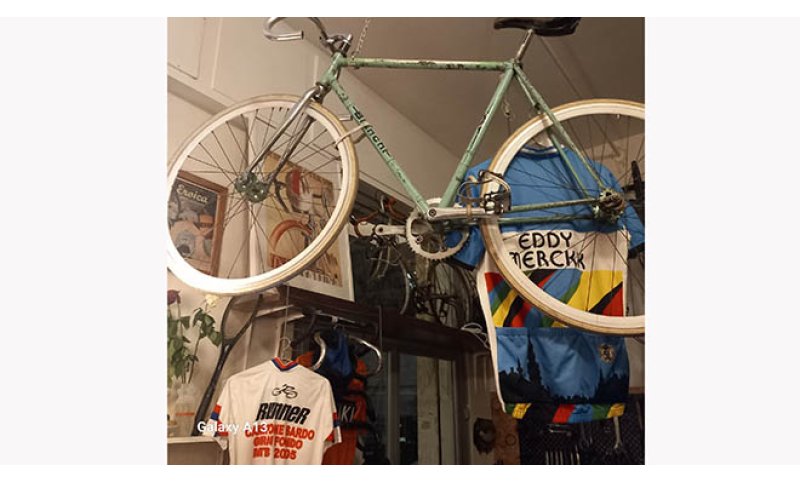 A Fausto Coppi, il Bar Coppi, sarebbe piaciuto. E forse si sarebbe commosso a vedere la sua immagine stampata sopra il bar – e ovviamente c’è anche Gino Bartali -, il marchio della sua Bianchi in biciclette esposte o riparate, il suo cognome dappertutto, perfino “Il Campionissimo” come nome scelto per la srl.