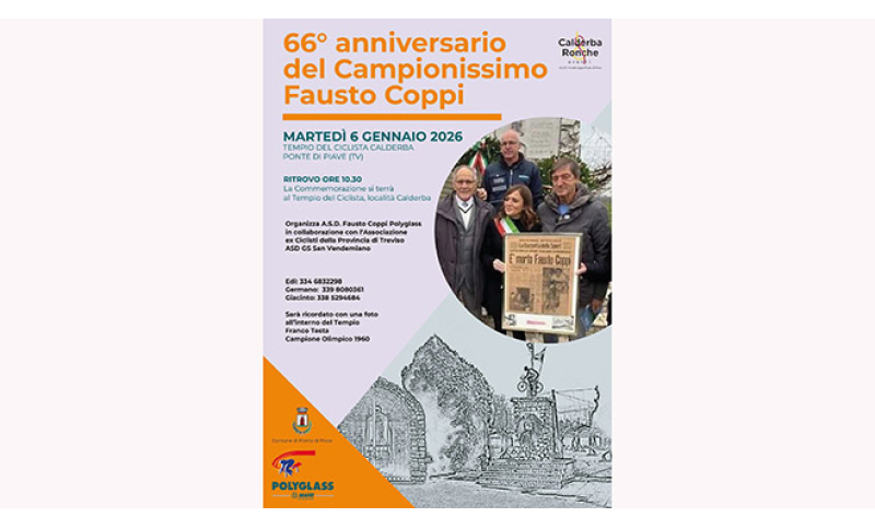 Anche nel 2026 ci sarà la cerimonia dedicata al ricordo del grande ed indimenticato campione Fausto Coppi, simbolo eterno del ciclismo e dello sport italiano, in occasione del 66° anniversario della sua scomparsa. La commemorazione si terrà martedì 6 gennaio presso il Tempio del Ciclista di Calderba, nel trevigiano, località ricca di storia e di passione per lo sport del pedale.