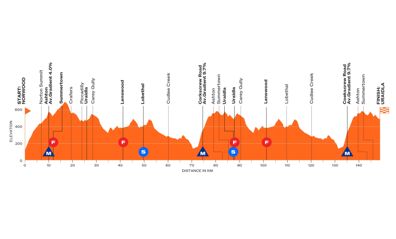La prima tappa in linea avrà partenza e arrivo a Tanuda per 120,6 km complessivi e tre giri di circuito che presentano la semplice salita di Mengler Hill (2,1 km al 3,4%), utile soprattutto ad assegnare la prima maglia di miglior scalatore. Sul traguardo dovrebbe essere volata a ranghi compatti. Più insidiosa la Tappa 2, che porterà i corridori da Norwood a Uraidla per 148,1 km: dopo la salita iniziale di Ashton (9,9 km al 4,3%), si entra in un circuito da 60 km da ripetere due volte, con la salita di Corkscrew (3,6 km al 6,7%) come punto chiave che taglierà sicuramente fuori i velocisti, essendo posto a 13 km dall’arrivo nel suo secondo passaggio. Da questa tappa usciranno i corridori interessati alla classifica generale.