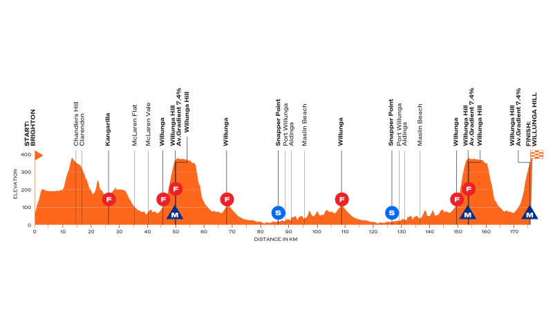 Per quanto l’esplosiva ascesa a Willunga Hill risultati quasi sempre determinante ai fini della classifica generale, non è da sottovalutare anche la tappa di chiusura, con partenza e arrivo a Stirling per un totale di 169,8 km. La frazione prevede 8 giri del circuito di Stirling, lungo 21 km, con la salita che porta al traguardo spezzata in due, una prima parte di 3,7 km al 3,6% e una seconda, dopo una breve contropendenza, di 2 km al 3,7%. Pendenze dolci, ma che ripetute 8 volte e dopo i primi 5 giorni di gara della stagione potrebbero comunque regalare qualche sorpresa.