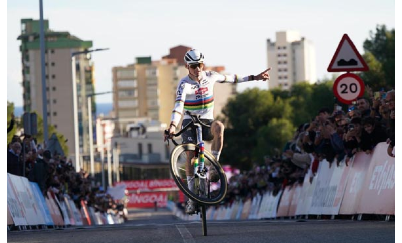 La voglia di vincere sembra appartenere ormai a Mathieu Van der Poel, che anche a Benidorm, in Costa Blanca, trionfa nella decima prova della Coppa del Mondo di ciclocross élite. In terra spagnola si ripete un copione già noto: l’iridato della Alpecin–Premier Tech prende il comando al secondo giro e non lo lascia più, imponendo ancora una volta la sua disarmante superiorità. Sotto un sole primaverile di Benidorm l'asso olandese ottiene la decima affermazione consecutiva, sesta in Coppa che gli prmette di consolidare il suo primato nella speciale classifica UCI. Van Der Poel anticipa Thibau Nys e l'idolo locale lo spagnolo Orts Lloret.