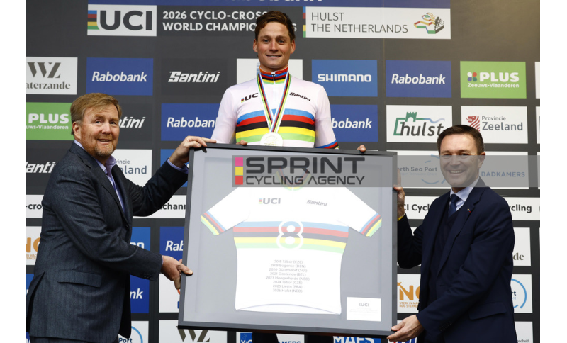 L’olandese è arrivato a Hulst da campione uscente ed andato via con una maglia celebrativa, sulla quale è stato scritto il numero 8 e i titoli vinti nel 2015, 2019, 2020, 2021, 2023, 2024, 2025 e 2026. Mathieu è senza dubbio il campione perfetto, che sul palco di Hulst ha ricevuto la maglia iridata dalle mani di Re Guglielmo Alessandro e dal presidente dell’Unione Ciclistica Internazionale David Lappartient.