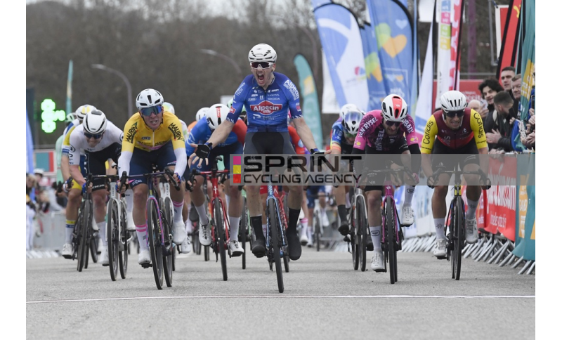 Il ventiquattrenne tedesco di Regensburg, al terzo anno nella formazione WorldTour dell’Alpecin-Premier Tech, esulta così per quella che è la prima vittoria da pro’ in carriera e la prima affermazione stagionale della sua squadra, unica compagine della massima serie ancora a zero podi in questo 2026 prima di oggi.