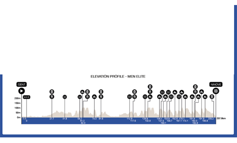 Solo il pavé di Paddestraat e Lange Munte e il circuito in due parti Haaghoek-Leberg rappresentano ostacoli significativi nella prima fase della gara. Dopo 120 chilometri, inizia la parte finale e più significativa, quando i corridori dovranno nuovamente risalire velocemente l’Haaghoek e Leberg. A 74 chilometri dal traguardo, possiamo dire che la parte finale inizierà davvero: ci sarà l'Eikenberg e, tre chilometri dopo, sarà la volta del Wolvenberg. Questa salita, senza pavé, di per sé non è troppo difficile, ma subito dopo ci aspettano i pavé di Kerkgate e Jagerij. Poi sarà il momento della celebre salita di Molenberg. La prova non sarà finita e a seguire ci saranno diversi tratti in pavé particolarmente insidiosi. È qui che i migliori si sono distinti più di una volta.