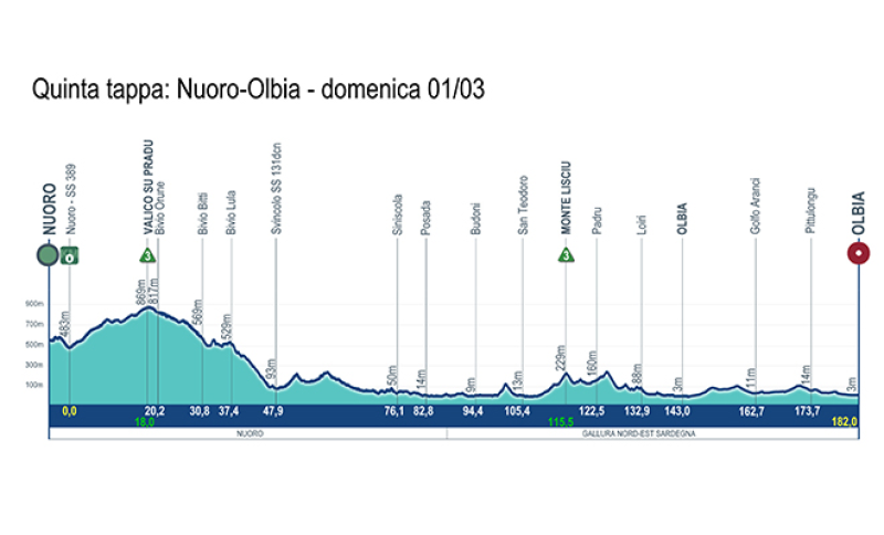 Il rinato Giro di Sardegna si conclude oggi con la quinta tappa, la Nuoro – Olbia di 182 km. Sulla carta, l'ultima tappa sembra destinata ad un arrivo a ranghi compatti; se il profilo altimetrico non presenta difficoltà particolari, una volta superata la lunga ma dolce salita che si trova nei primi 20 km, le insidie potrebbero però venire dal vento, visto che per numerosi chilometri il tracciato si snoderà non lontano dal mare.