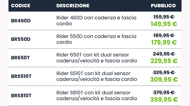 I modelli Bryton Rider 460D, Rider 550D, Rider 650T, inclusi i modelli top di gamma Bryton Rider S810T e Rider S510T sono quindi disponibili a prezzi ribassati.