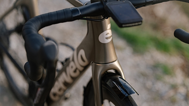 Lo si dice qui sopra in tre parole, basta? L’interasse di 1030 mm, i foderi posteriori lunghi 415mm e l’angolo di sterzo di 72° parlano chiaro. C’è il giusto grado di agilità in questo telaio, ma anche una clearance che vi permetterà di sperimentare fino a pneumatici larghi 36mm ( 34mm se montate il parafango. In questo telaio c’è ordine e un fascino minimalista che spesso caratterizza le biciclette Cervélo. Il sistema Semi-Integrated Apero-Style Cable Integration semplifica la vita, soprattutto a chi si fa manutenzione da solo. La forcella si integra alla perfezione nel tubo obliquo e gode di una maggiorazione di 1mm nell’offset, abbastanza per accogliere molto bene pneumatici larghi fino a 36mm. Nel complesso, l’impatto frontale è stato ridotto e reso più aerodinamico. A confermare la comodità di questa bici ci pensa anche il nuovo seat post da 27,2mm, ottimo nella gestione delle sollecitazioni. Il telaio gode anche di passaggi interni ottimizzati per accogliere i gruppi meccanici, un dettaglio che a mio parere rende questa bici ancora più interessante.