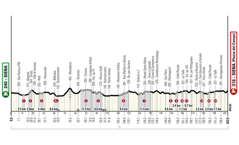La breve storia di questa corsa è ricca di eroismi, di attacchi e sconfitte ed è per questo che i corridori la amano e la odiano, per quella ricerca della vittoria, che con le sue strade di creta polverosa sa mettere in ginocchio anche il più forte dei guerrieri. Guardando il percorso, ci sono le classiche strade della provincia senese che si arrampicano su colline dove i tratti in ombra vengono decisi da sentieri con curve ricalcate da cipressi. Il percorso è un po’ cambiato e gli organizzatori hanno deciso di tagliare un totale di sedici chilometri di sterrati, accorciando la gara di dodici chilometri rispetto all'edizione dello scorso anno. Il finale mozzafiato non è stato modificato, ma la domanda rimane la stessa: sarà ancora Tadej Pogacar a vincere su Piazza del Campo?