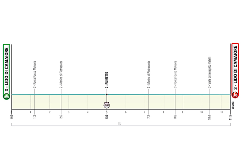 Si parte da Lido di Camaiore per raggiungere Fiumetto e affrontare qui le uniche curve, necessarie per disegnare la classica inversione a U, e intraprendere la via del ritorno. Seguono 5,3 km per ritornare al Lido di Camaiore dove una svolta "a S"- destra sinistra con carreggiata ristretta - immette nell’ultimo chilometro.