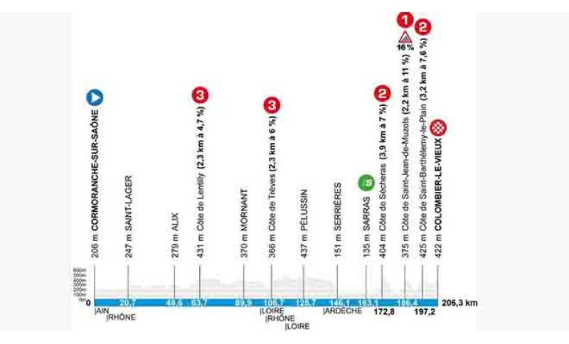 Dopo aver percorso circa 100 chilometri il gruppo incontrerà la Côte d'Échalas, con una lunghezza di 4,7 chilometri e una pendenza media del 5,1%. Superati altri 60 chilometri tranquilli, andando verso il Rodano, il plotone incontrerà la Côte de Sécheras, una salita di 3,9 chilometri al 7%. A questo punto mancheranno meno di 30 chilometri al finale e avrà inizio la parte più impegnativa della giornata. I corridori avranno a che fare adesso con la Côte de Saint-Jean-de-Muzols, lunga  2,2 chilometri e una pendenza media dell'11% e subito dopo arriverà una discesa. Superata questa parte si giungerà alla Côte de Saint-Barthélemy-le-Plain che salirà per 3,2 chilometri al 7,6%. L'ultimo chilometro avrà invece una pendenza del 2,9%.