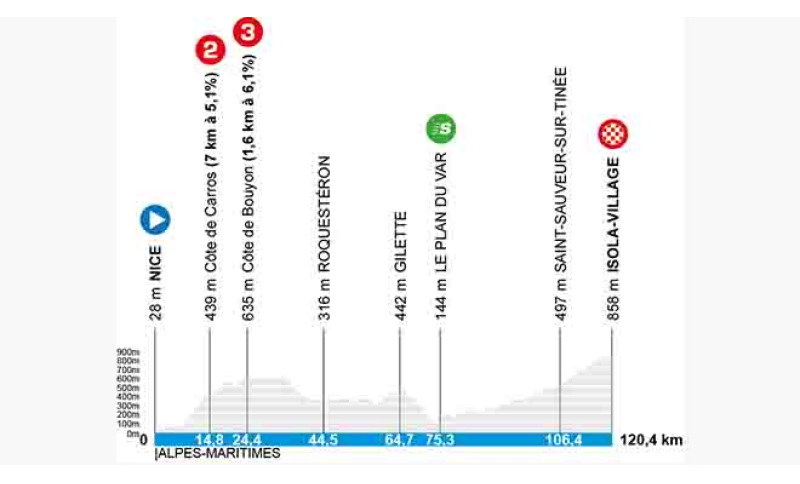 L'arrivo della settima tappa sarà quindi a Isola, dove era già previsto lo sprint intermedio, poiché le condizioni meteorologiche non hanno permesso di spostare il finale su un altro arrivo in salita. Di conseguenza, la distanza della tappa è ridotta a 120,4 chilometri, diversamente dal percorso originario che prevedeva una distanza di 138,7 km, con 2580 metri e arrivo in quota a 1600 metri, al termine della salita verso Auron lunga 7,4 chilometri.
