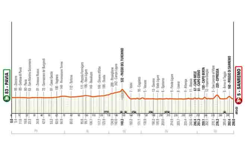 Subito dopo il via, il tracciato punta a nord in direzione Milano per fare un piccolo circuito attorno a Pavia. Si sfila davanti alla Certosa, c’è un secondo passaggio dentro la città e infine si riprende il percorso classico in direzione di Voghera e Tortona. Le difficoltà sono sempre le stesse: Passo del Turchino a 149 km all’arrivo (5,6 km al 2,9% medio, punte del 7%); Capo Mele (- 51 km al traguardo: 1,8 km al 3,6%); Capo Cervo (- 46 km: 2,1 km al 2,5%), Capo Berta (- 39 km: 2 km al 6,3%), Cipressa (- 21 km: 5,6 km al 4% con punte del 9%) e infine il Poggio, il punto chiave della Classicissima. Si affronta quando mancano 9,3 km alla conclusione; misura 3,7 km al 3,7% medio e punte dell’8% dopo il Santuario della Madonna della Guardia a circa 700 metri dallo scollinamento, con un dislivello di 136 metri, 30 curve e 4 tornanti. Dalla vetta mancano 5,6 km all’arrivo: 3,3 km di discesa estremamente complicata e 2,3 km di pianura fino al traguardo di via Roma. Il rettilineo finale tira leggermente al 2%.